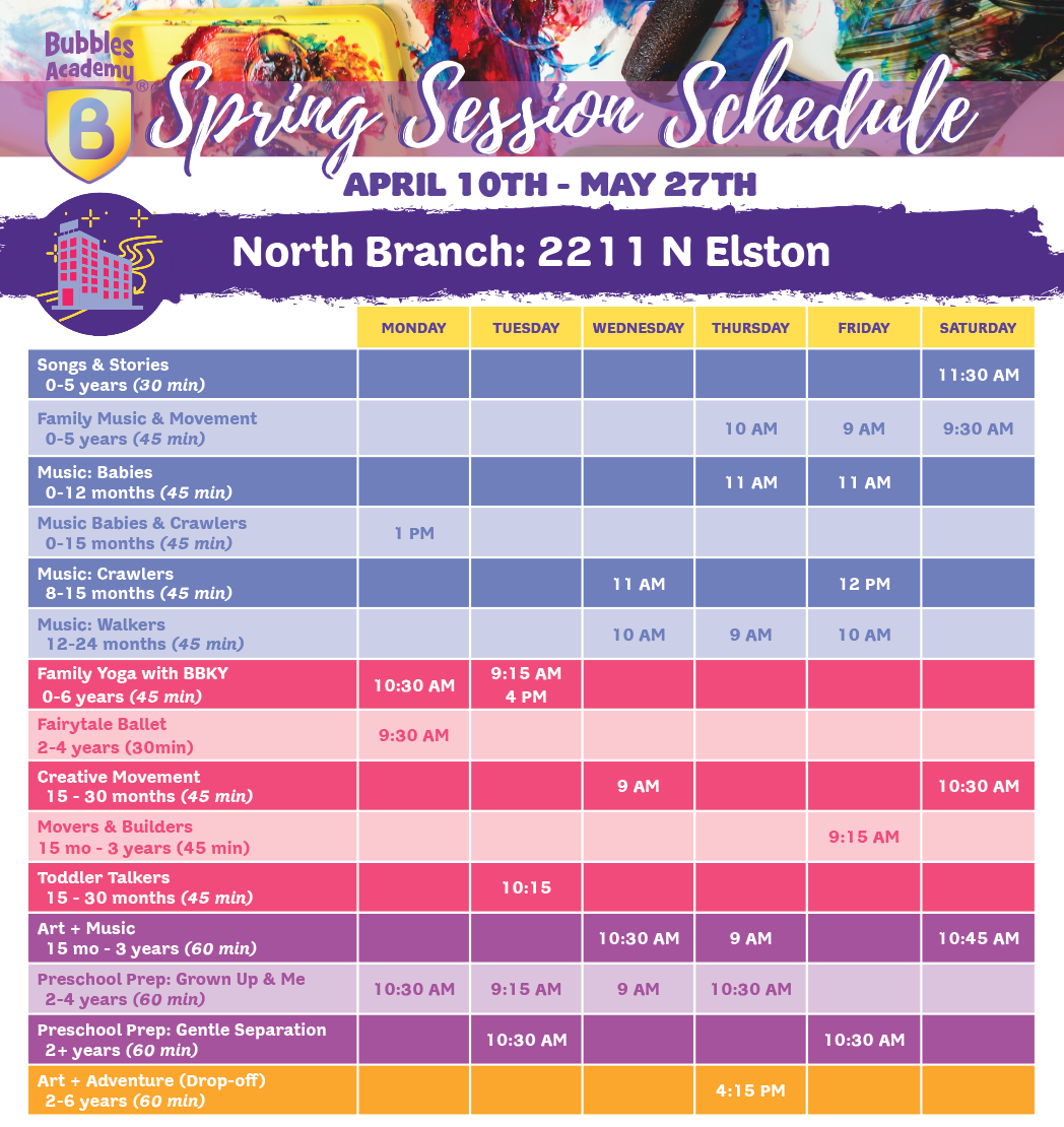 – Bubbles Academy North Branch: A dedicated indoor home for all caregiver/child and drop off classes! Bubbles North Branch is located at 2211 N. Elston Avenue 1st floor, across the street from the Bubbles Academy Preschool building.