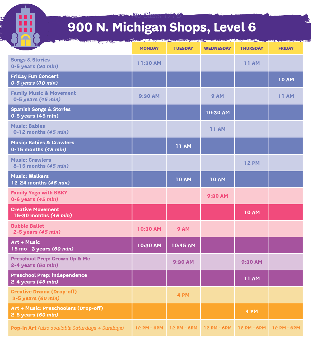 – Bubbles Academy 900 N. Michigan Shops: Join us for classes across Music, Movement, Art, Preschool Prep, plus weekly drop-in art and curated retail featuring local mom-owned businesses. Drop-ins are available here! >> Click for more info